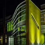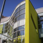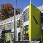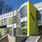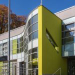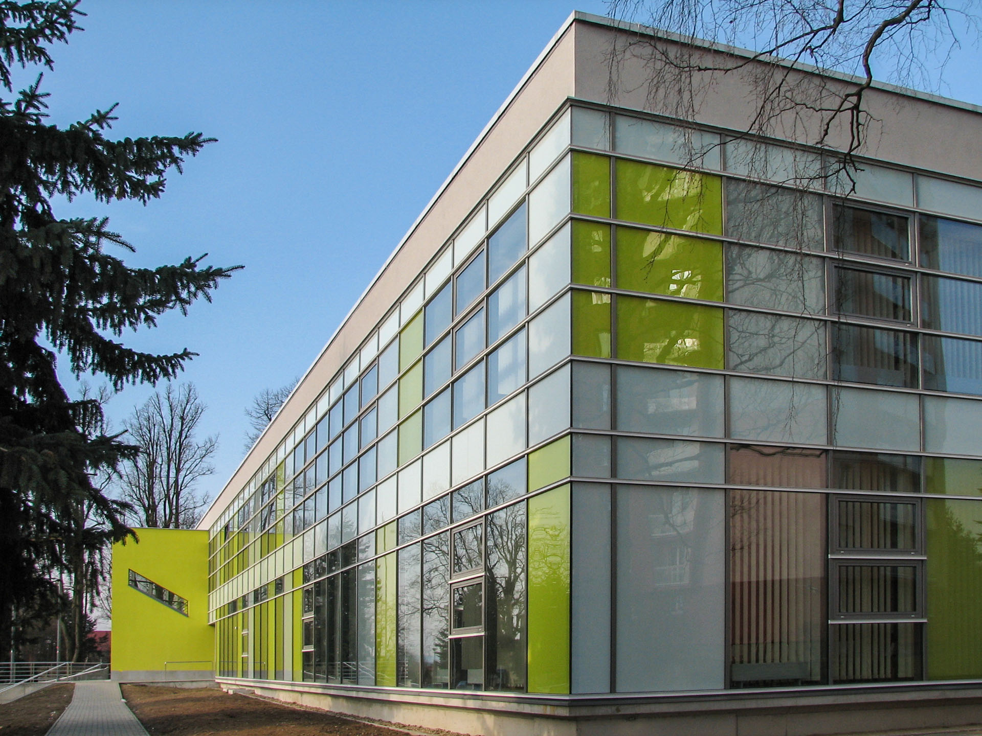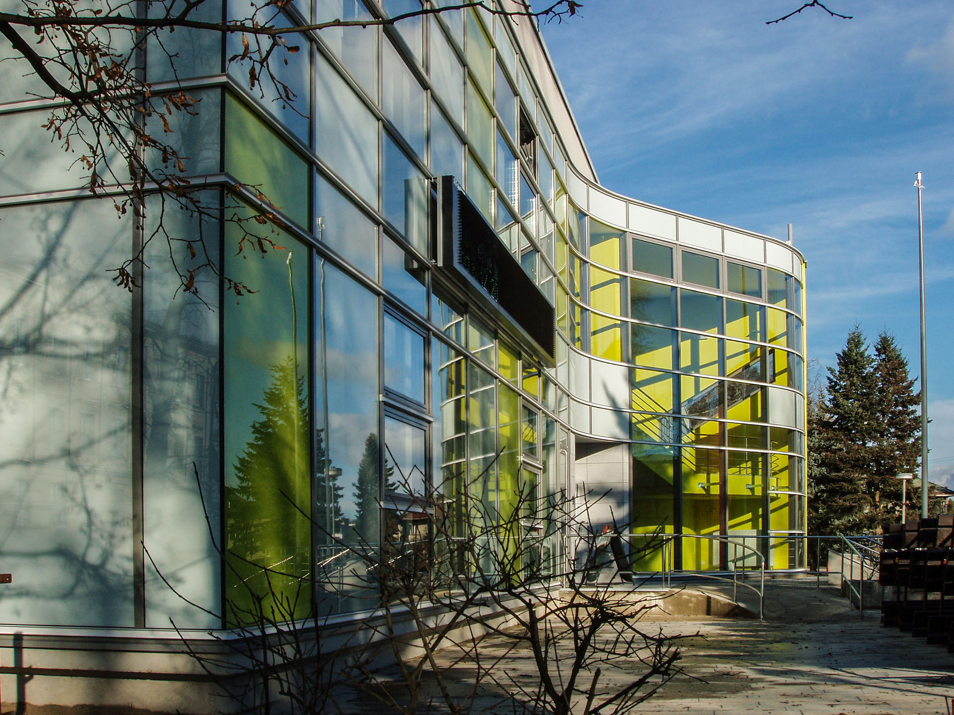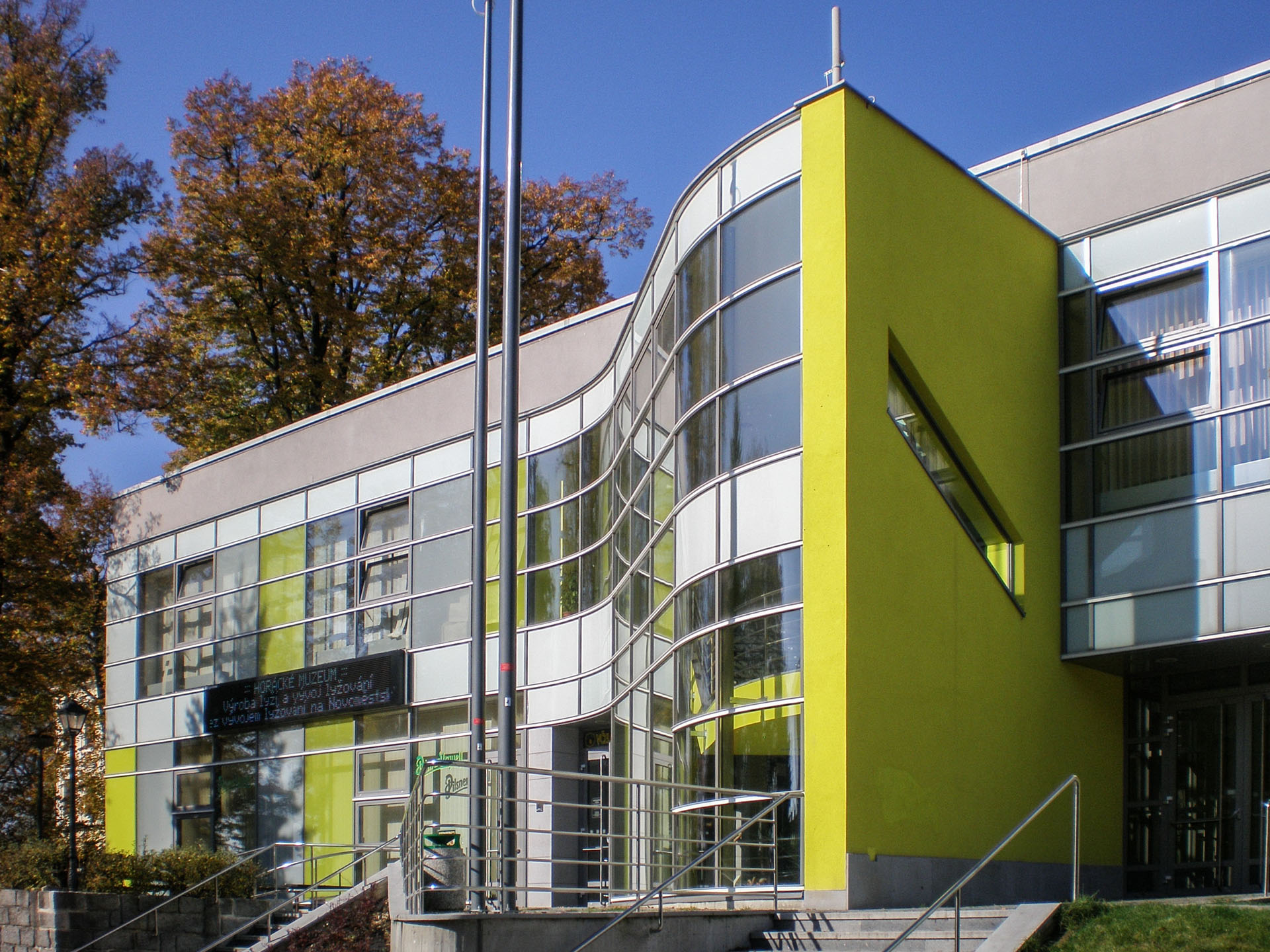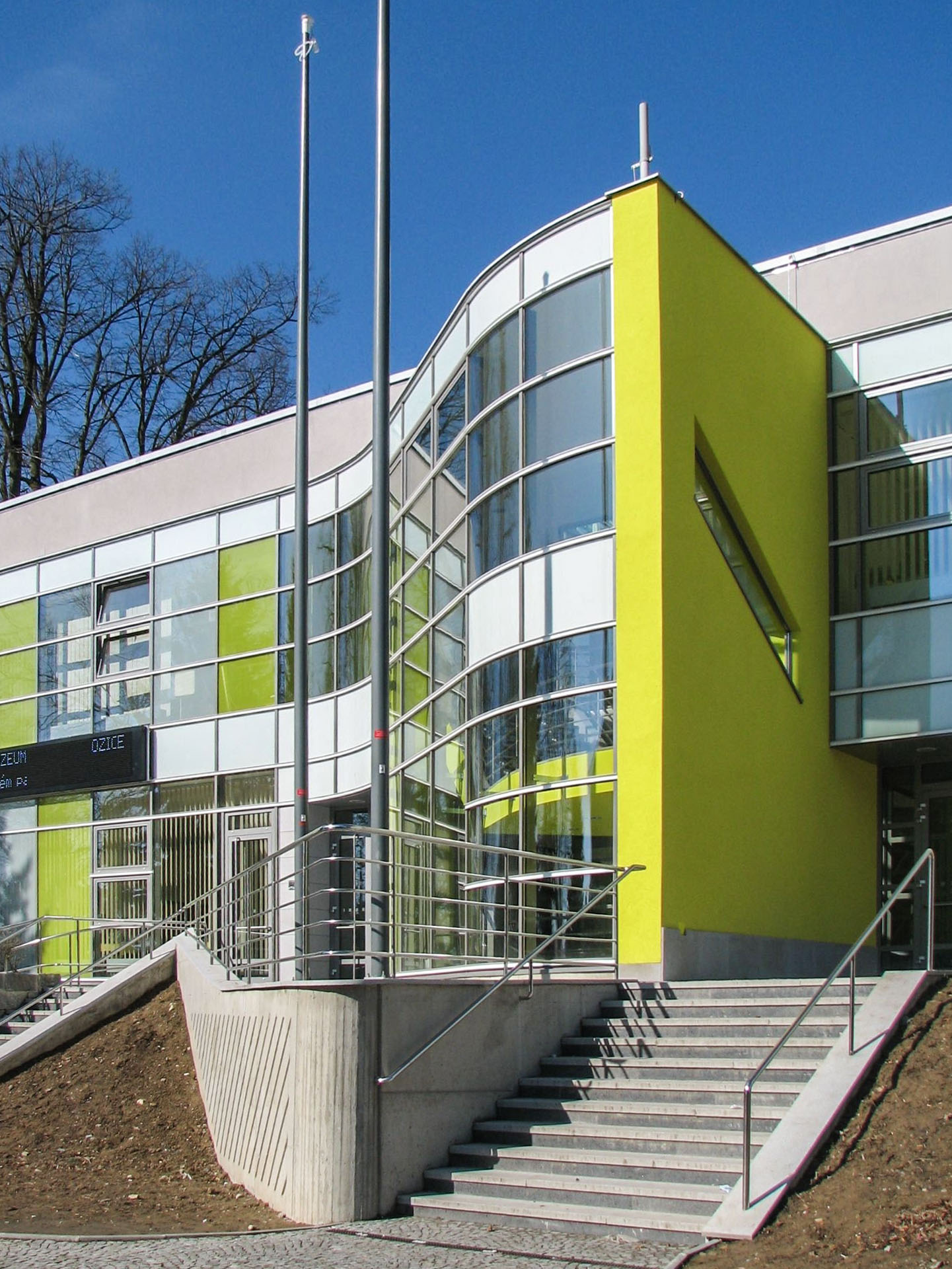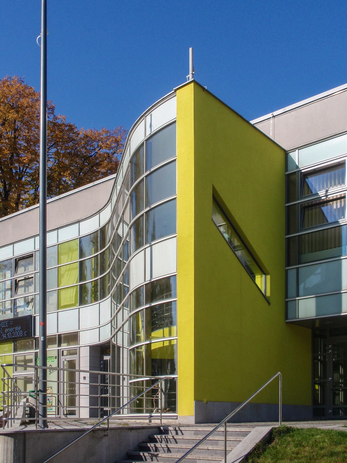 nová prosklená barevně řešená fasáda a dále nástupní venkovní terasa a související úpravy včetně nástupních schodišť s automatickým odmrazováním.