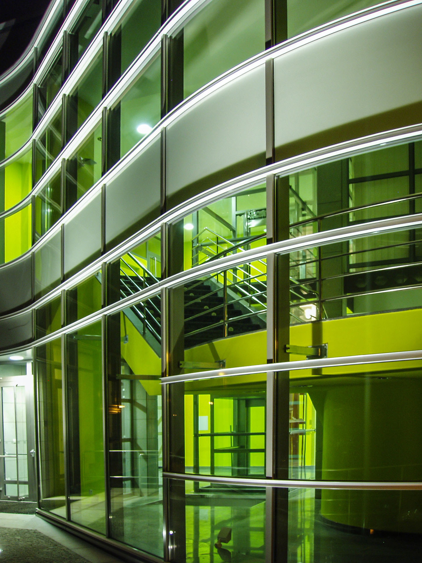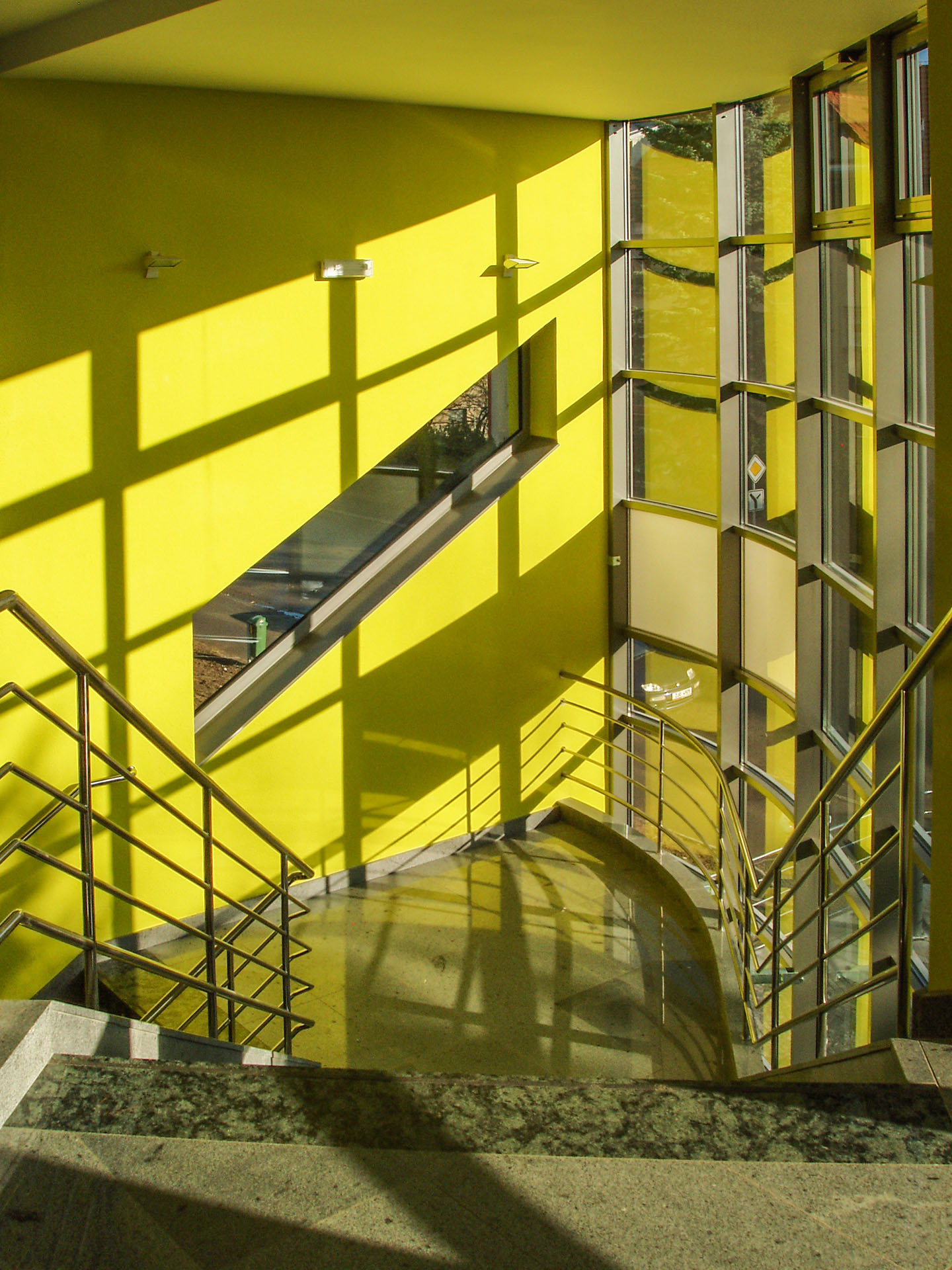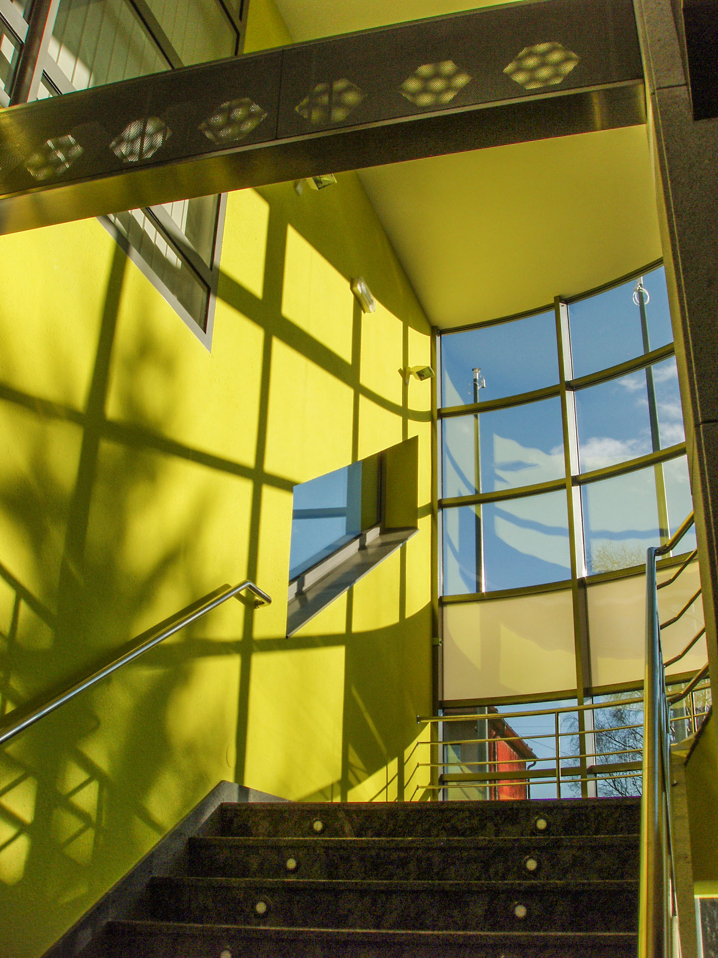 Jako zcela nový významný charakteristický prvek bylo z hmoty objektu vysunuto a vytvarováno reprezentační schodiště s proskleným výtahem s horním prosvětlením a prosluněním.